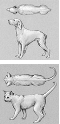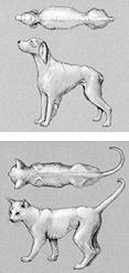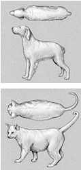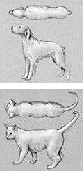 Dogs: Ribs are easy to feel and may be visible without any palpable fat. The tops of the lumbar vertebrae are visible and pelvic bones are becoming prominent. There is an obvious waist present. Cats: Ribs can be felt with minimal fat cover. Lumbar vertebrae are obvious. There is an obvious waist and minimal abdominal fat. |